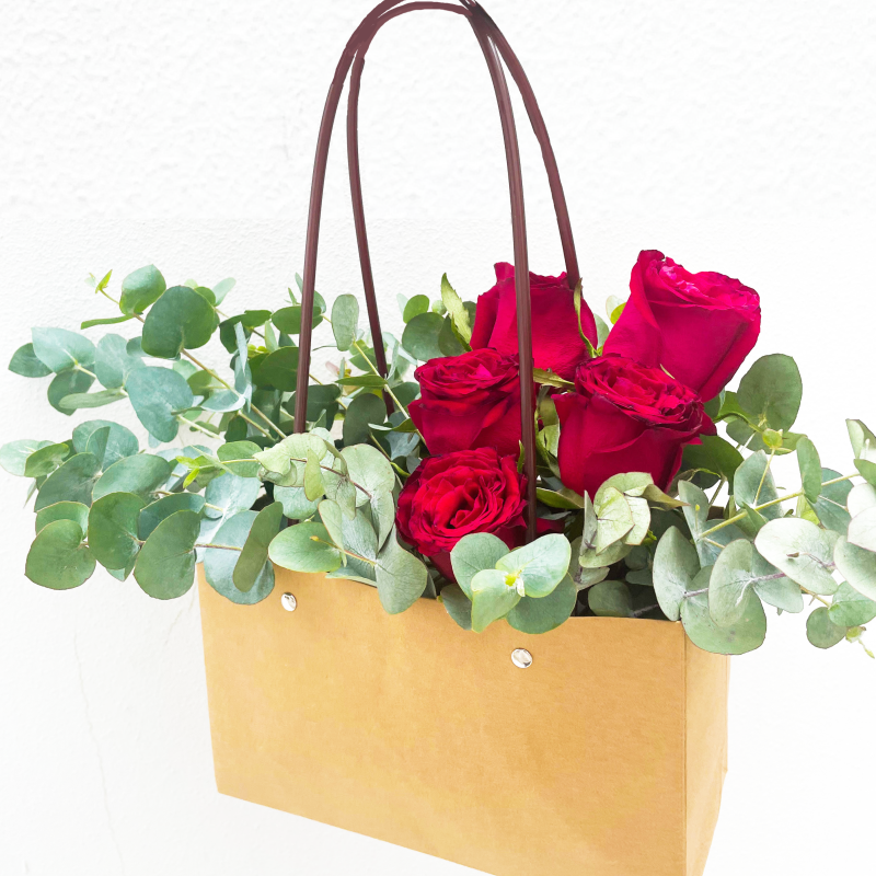 5 red roses and fresh eucalyptus leaves in a giftbag