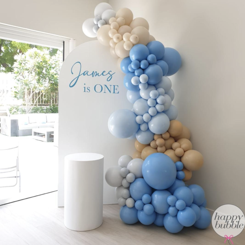 1st Birthday Boy (2m Semi arch backdrop - white Personalization on the backdrop 1 x Balloon garland 1 x Medium circle table - White)