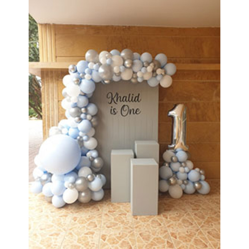 Elegant Grey First Birthday ( Grey backdrop,  Personalisation on backdrop,  3 grey plinths,  Balloon arch & Number foil balloon )