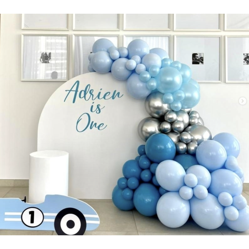 Mini Cars (Balloon garland 1.3m Semi arch backdrop - White 1 x small circle table - white Personalisation on Backdrop 1 x Car foam board)