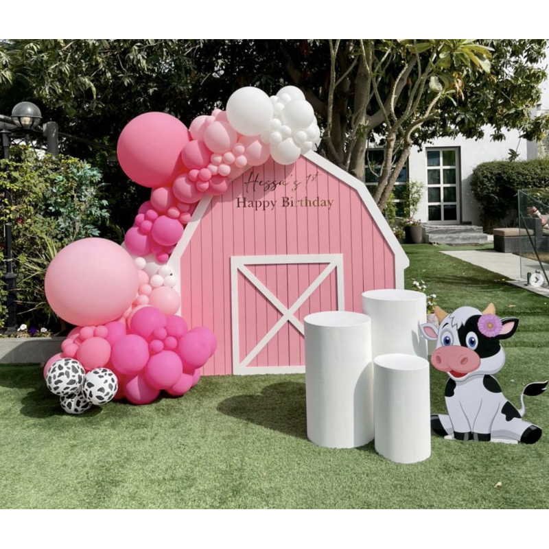 Pink barn house (Barn House backdrop 2m high- pink and white Personalization on backdrop Balloon garland 3 x white circle tables 1 x cow foam board (1m height))
