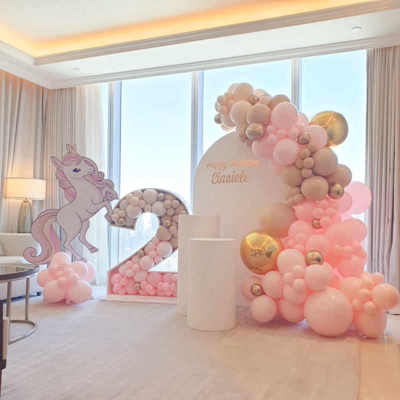 Unicorn Dreams (1.8 m Semi Arch (white ) Personalizattion (3 words max) Number 2 Structure filled with balloons 2 cake stands 1 x unicorn foam board stand )