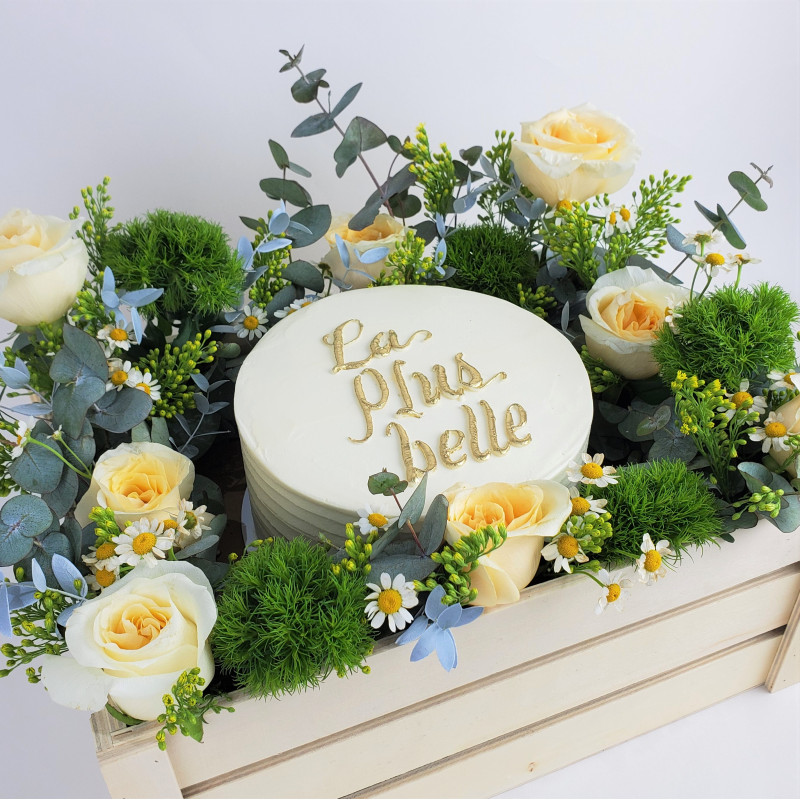 • A New day Botanical Cake Basket - Combination of Flowers and Cake