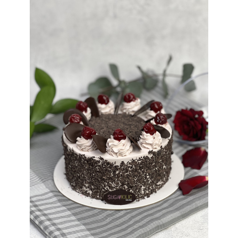 • Indulge in the classic taste of Black Forest Cake, featuring layers of moist chocolate cake, whipped cream, and cherries. Our version of this timeless favorite is decorated with chocolate shavings and cherries on top, creating a stunning presentation that