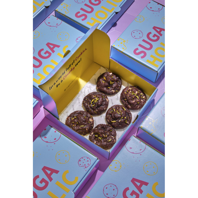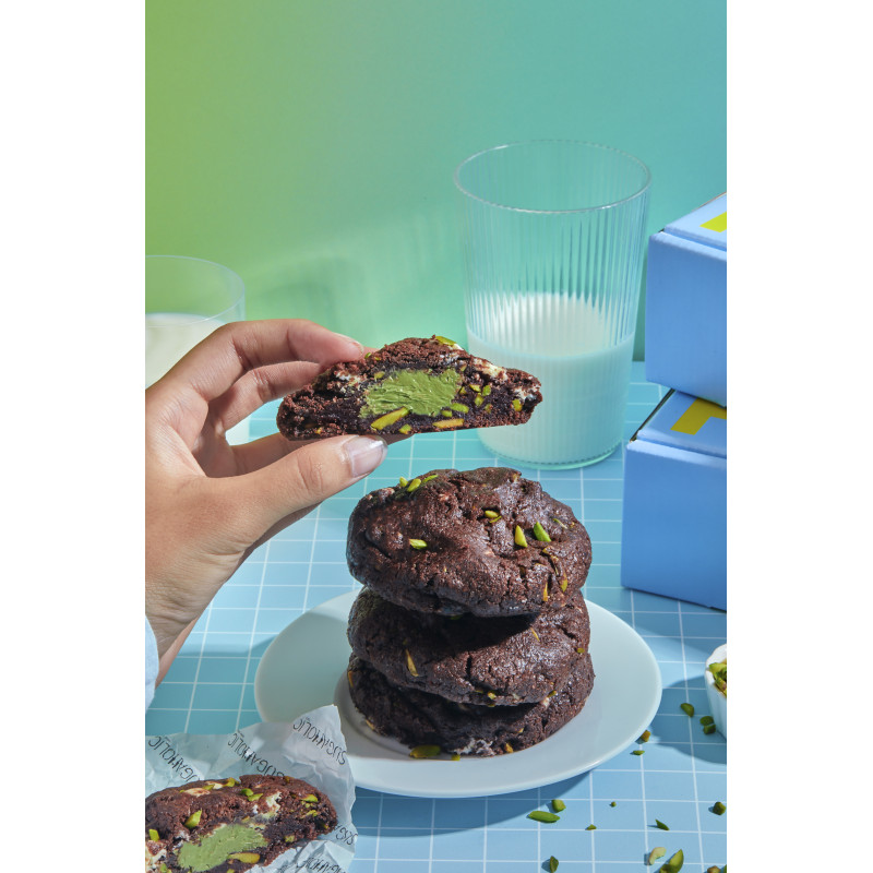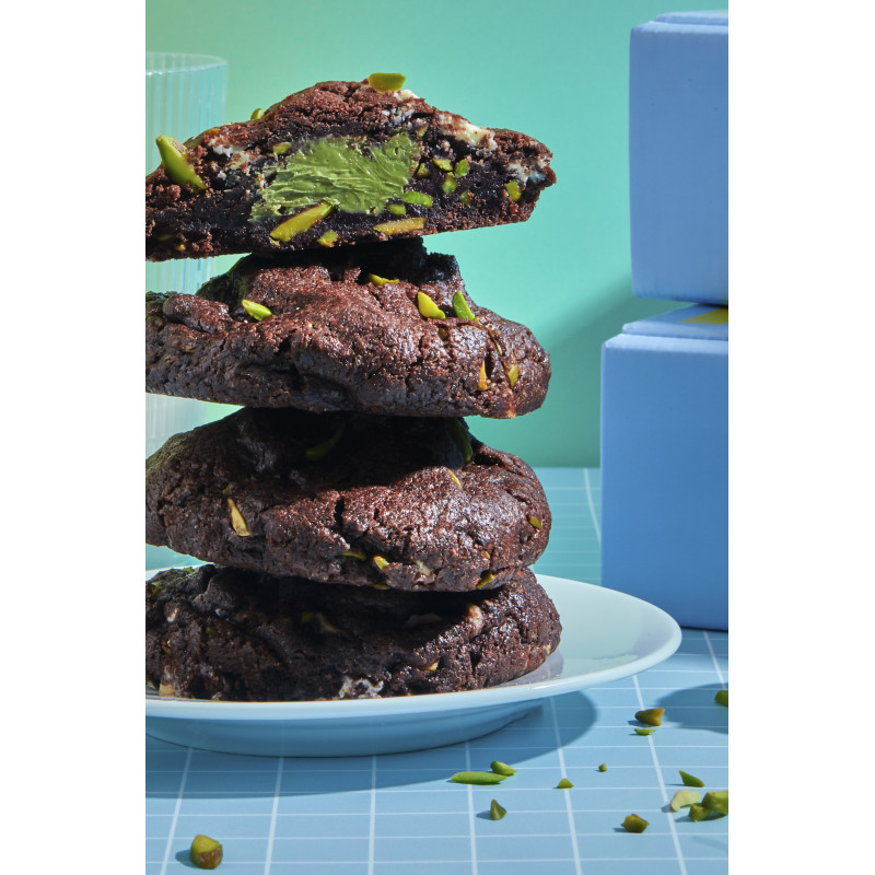 A party in your mouth! Dive into a chocolatey cookie filled with real pistachio pieces, white chocolate chips, and a gooey pistachio surprise at the center.