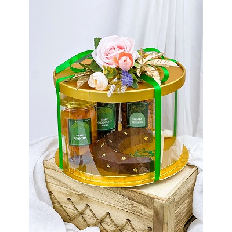 Includes Plastic Jars, size 450ml Jars which consists of Pistachio Cakepops, Masala Peanuts and Dried Apricots along with a dark chocolate moon shape smash which has Ferrero's and chocolate gold coins inside.