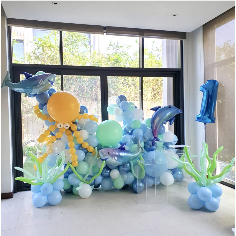 Under the sea (Mini balloon wall with octopus(golden rod and 3 fishes (foils) approx. 1.5m high 3 x sea weeds 1 x Medium and 1 x large acrylic table personalization on the balloons Number 1 foil balloon)